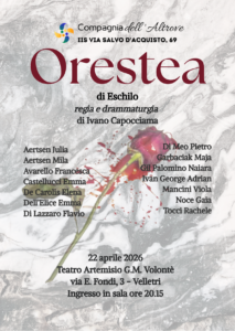 Mercoledì 22 aprile 2026, alle ore 20:00, il sipario del Teatro Artemisio G.M. Volontè di Velletri si aprirà su una delle opere più potenti della drammaturgia occidentale: l’Orestea di Eschilo, nella regia e drammaturgia di Ivano Capocciama. A portarla in scena sarà La Compagnia dell’Altrove, la compagnia teatrale dell’Istituto di Istruzione Superiore “Via Salvo D’Acquisto, 69” di Velletri, nell’ambito della IV Edizione del Palio Teatrale Studentesco – Città di Velletri.